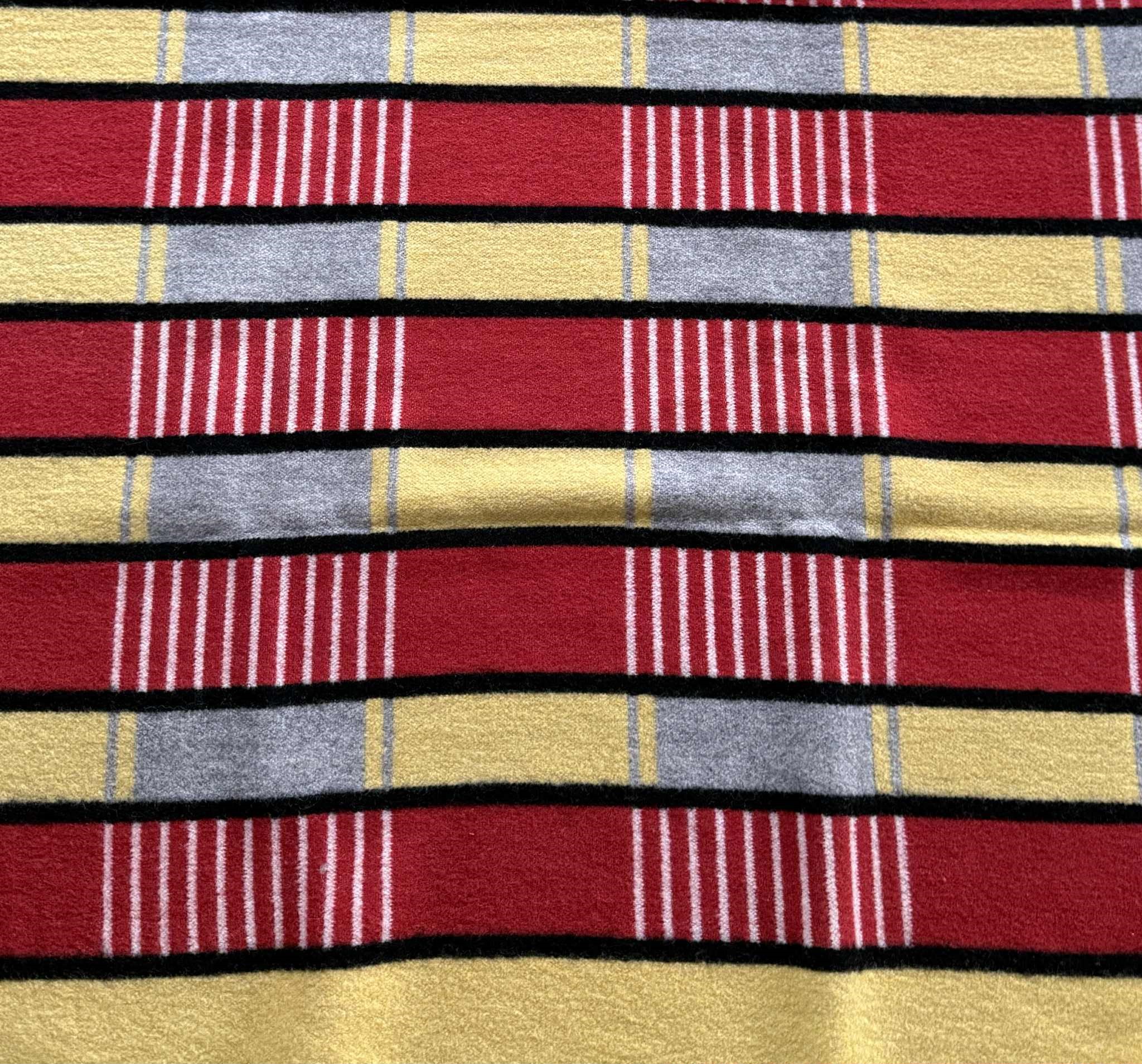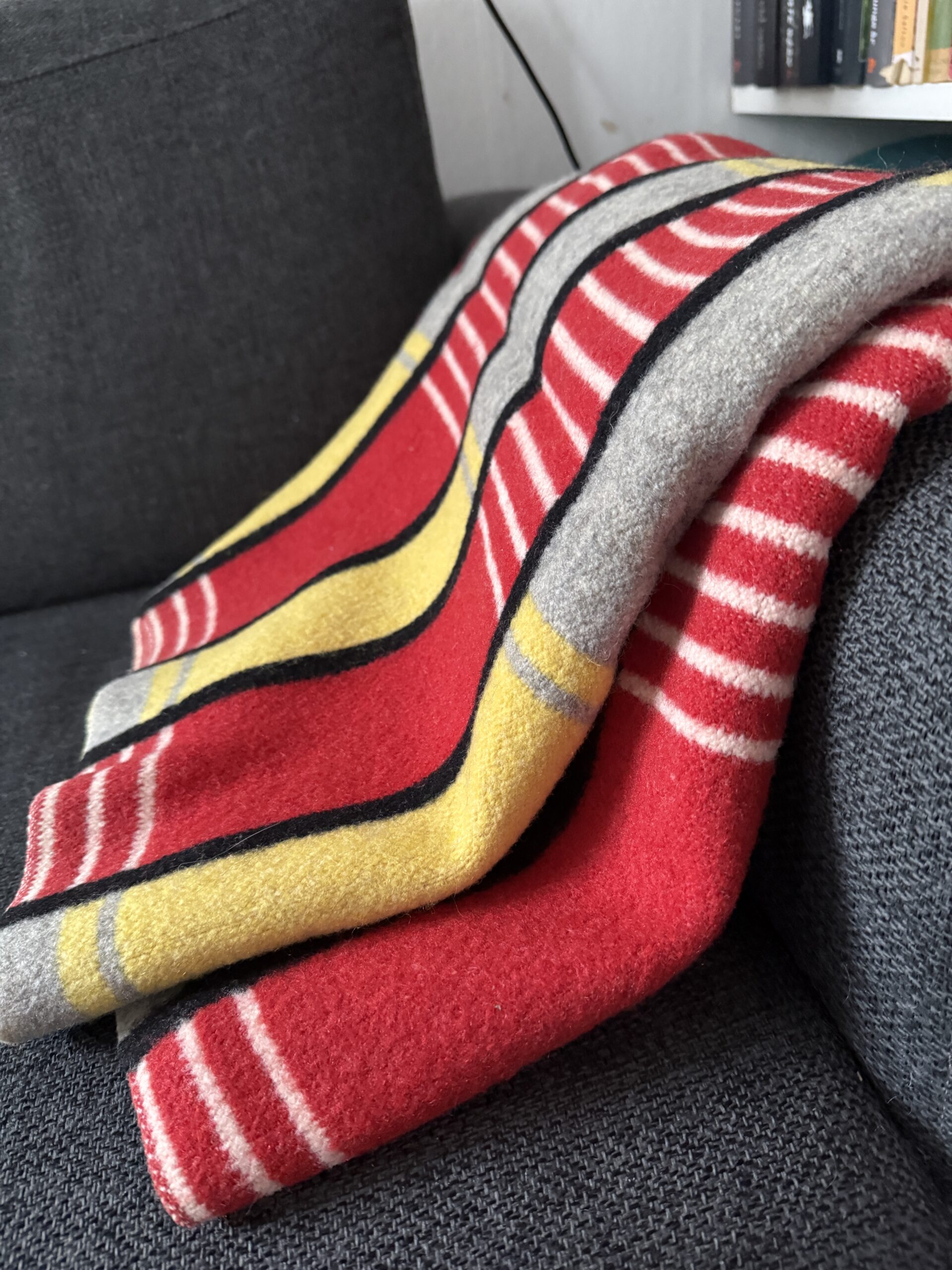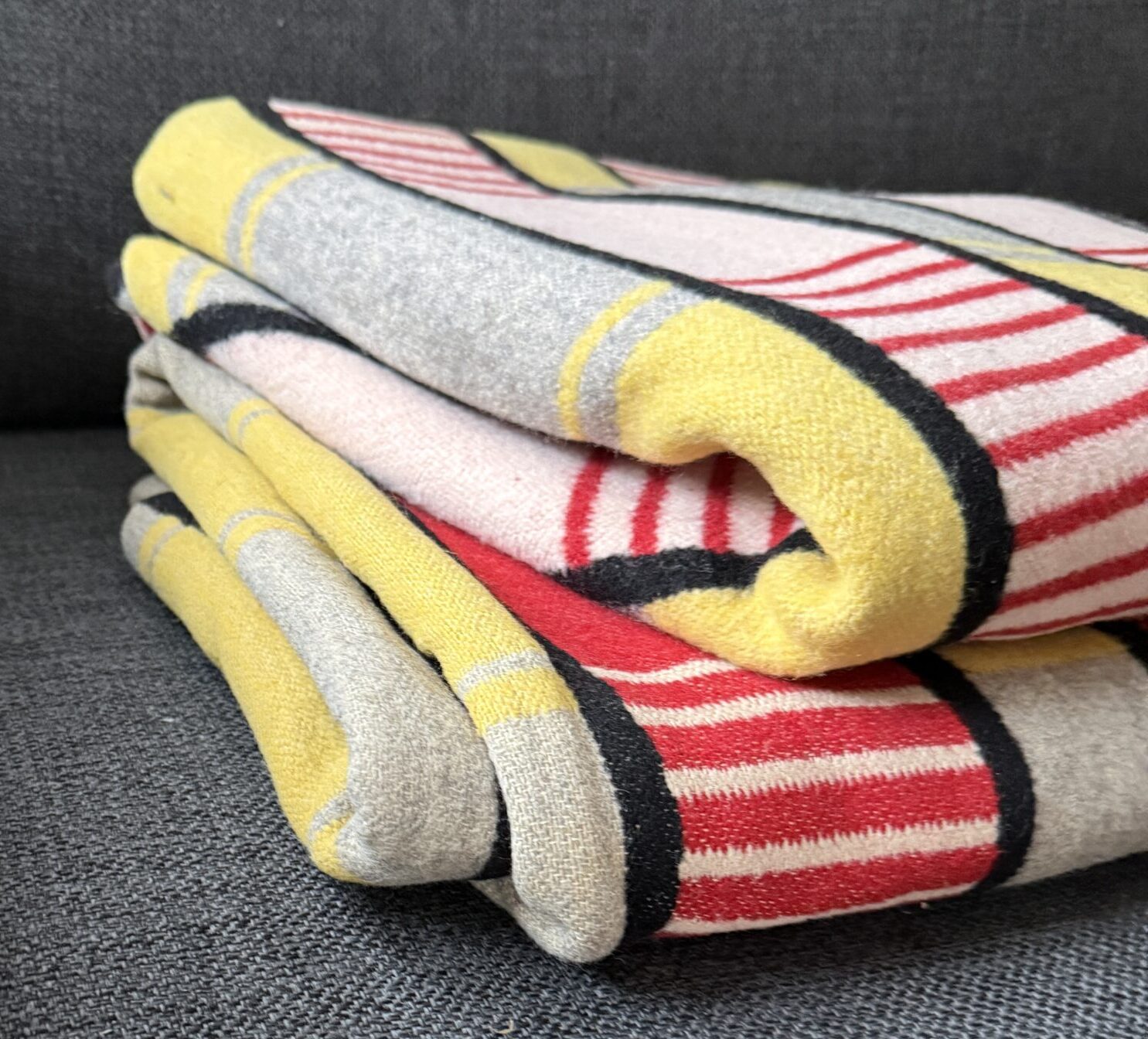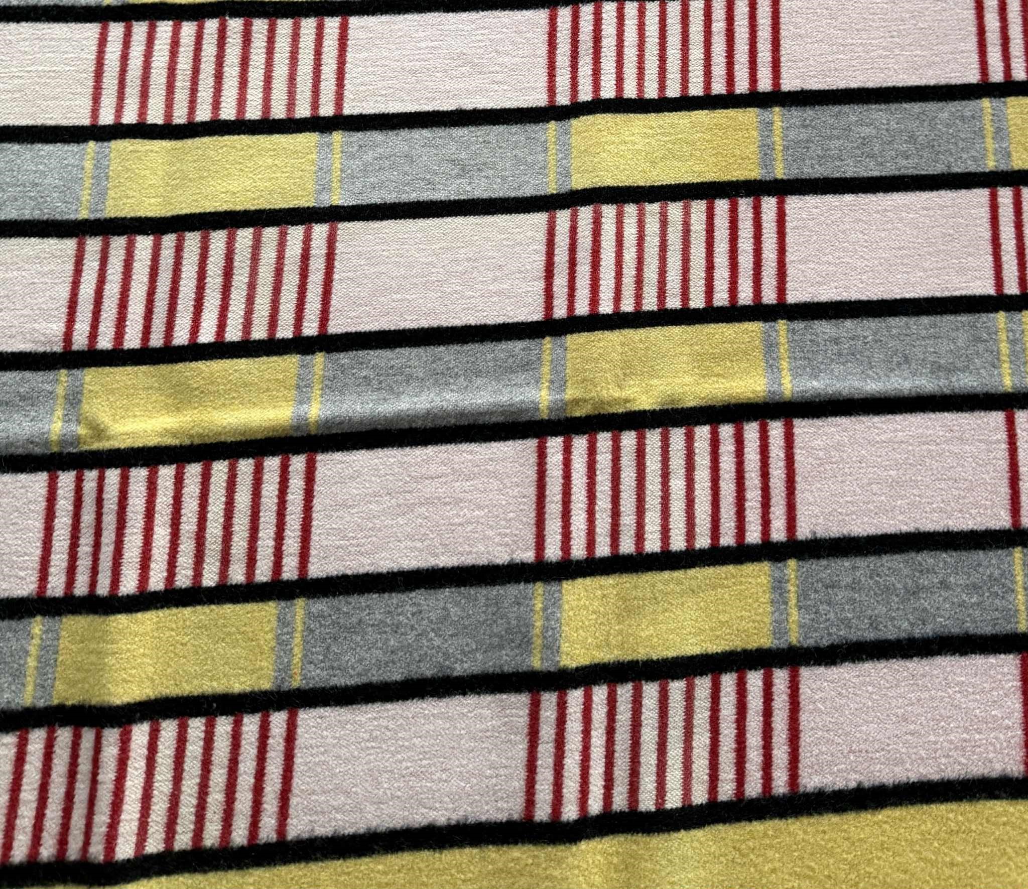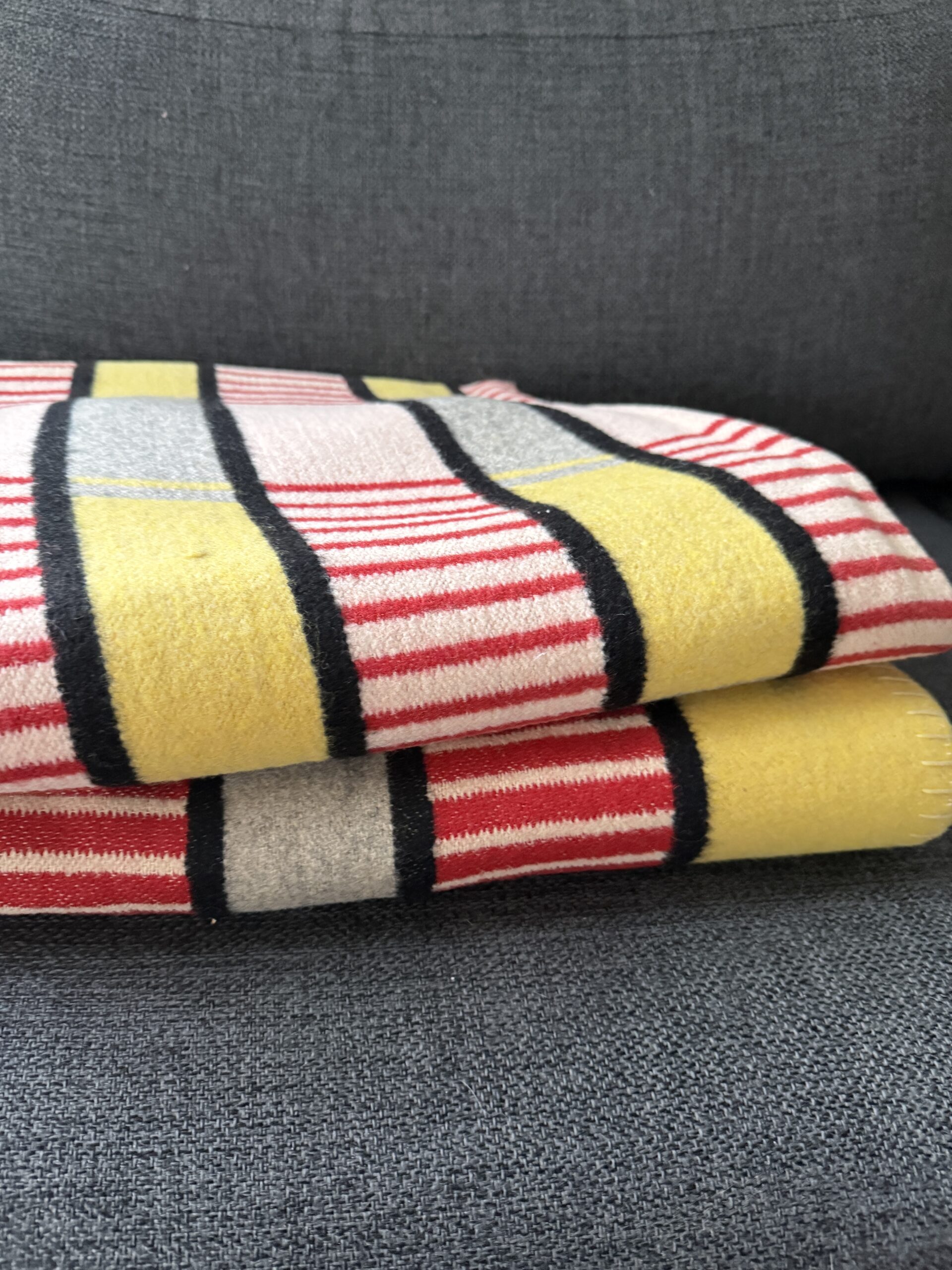 Uldtæppe med ægte 50’er-vibes – klare farver, stramme striber og den der retro-ro, der gør sig så godt i en moderne sofa. Tæppet er vendbart, så mønsteret skifter karakter på for- og bagside, og de har den varme, tætte uld-fornemmelse, man ikke helt får i nye materialer.