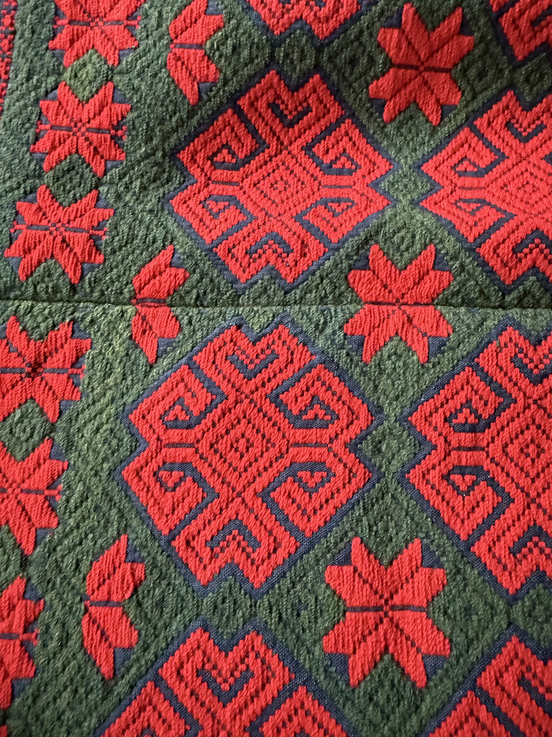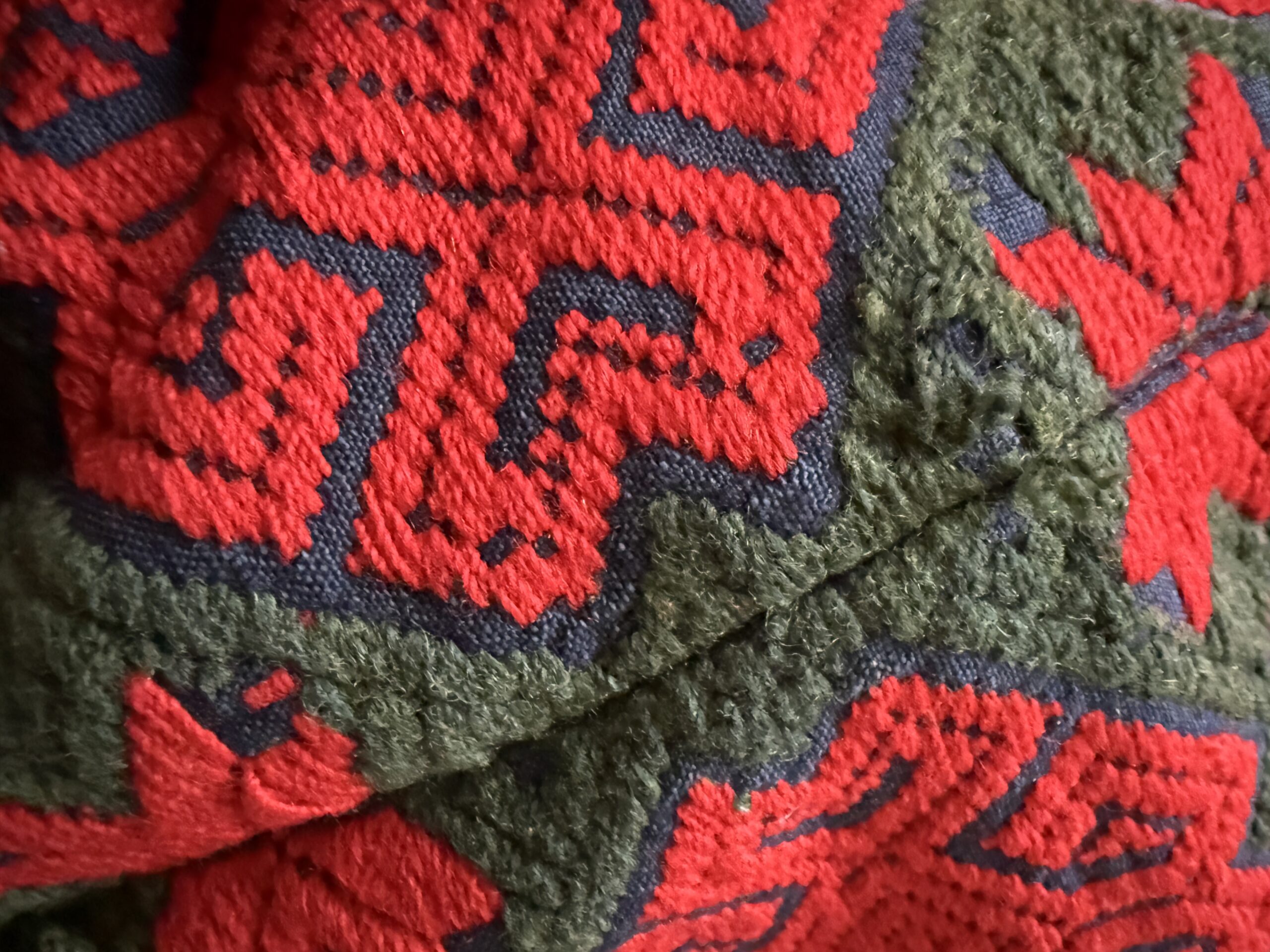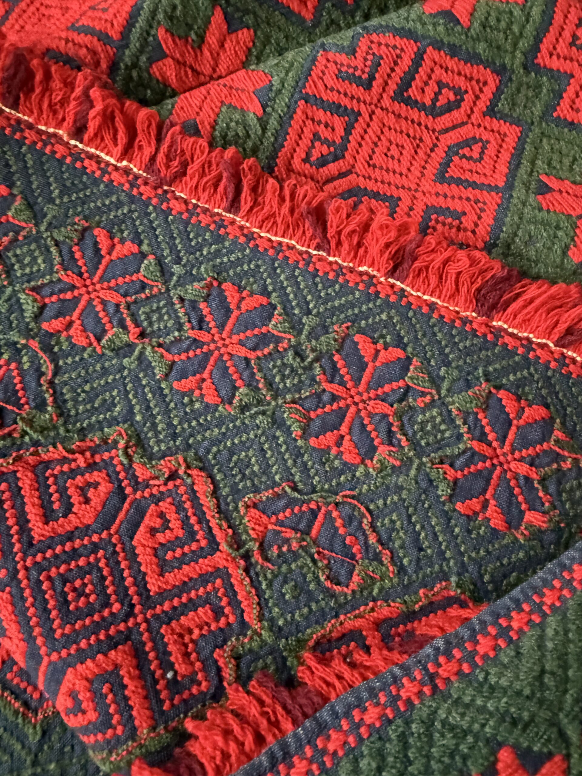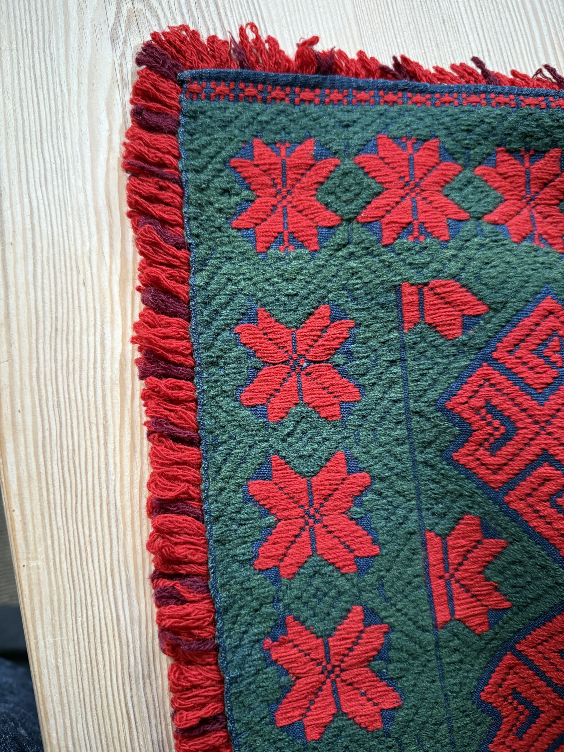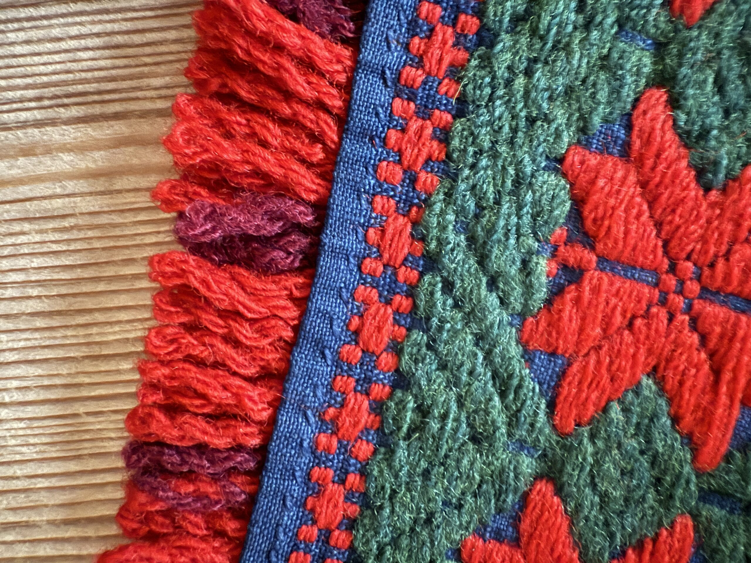 Det her stykke er skandinavisk håndværk, når det er bedst: vævet i uld og hør. Bunden er mørkeblå hør og mønstret er en klassisk rød og grøn uld farveholdning med et stort, smukt mønster og små stjerner, der får fladen til at leve. Langs kanten er der en rød uldfrynse, sirligt syet på, som giver en fin afslutning og understreger det håndlavede præg.